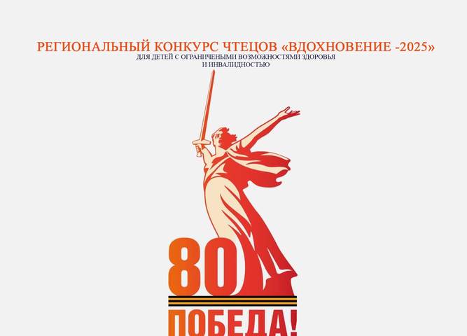 Региональный дистанционный конкурс чтецов «Вдохновение-2025», посвященный 80-летию Победы в Великой Отечественной войне будет проходить с 3 марта по 29 апреля 2025 года. В нем могут принять участие дети с ограниченными возможностями здоровья и инвалидностью с 6 до 18 лет.